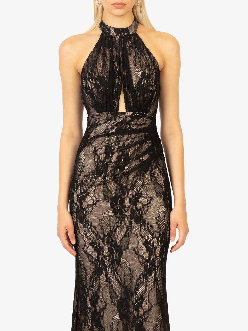 Ein festliches Abendkleid mit einer atemberaubenden Rückenansicht. Das Oberteil betont den Schulterbereich und der fließende Rock sorgt für Bewegungsfreiheit. Ideal für glamouröse Events oder Abendveranstaltungen.