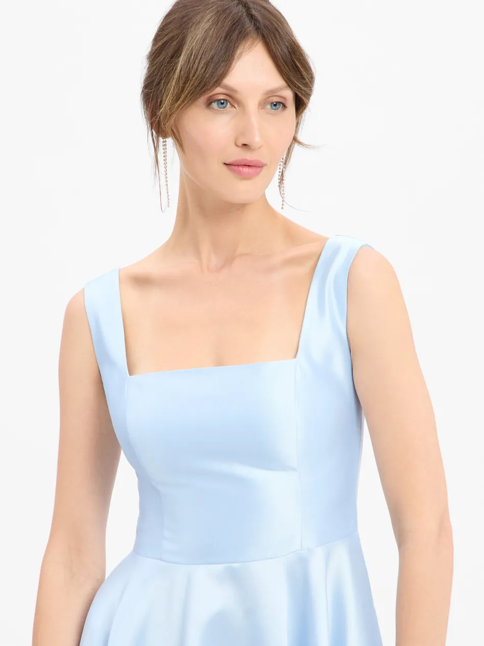 Der Karree-Ausschnitt unterstreicht den cleanen und eleganten Stil des Marie Lund Abendkleides, das dank des ausgestellten Rockteils wunderbar fällt.