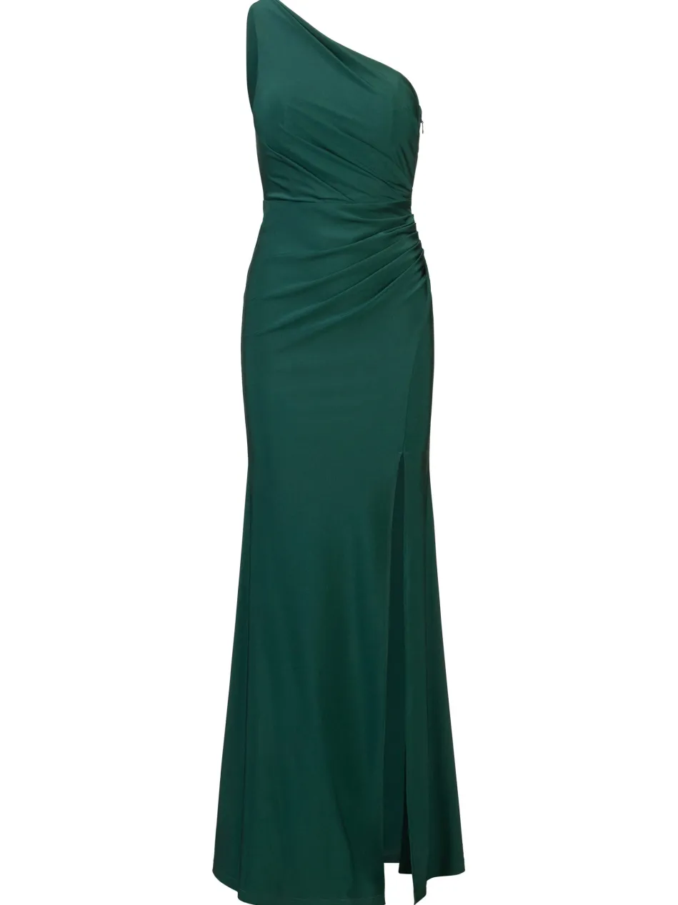 Feminin und stilvoll: Dieses figurbetonte Abendkleid mit One-Shoulder-Schnitt, edlen Raffungen und hohem Schlitz vereint moderne Eleganz mit glamouröser Ausstrahlung – perfekt für besondere Anlässe.
