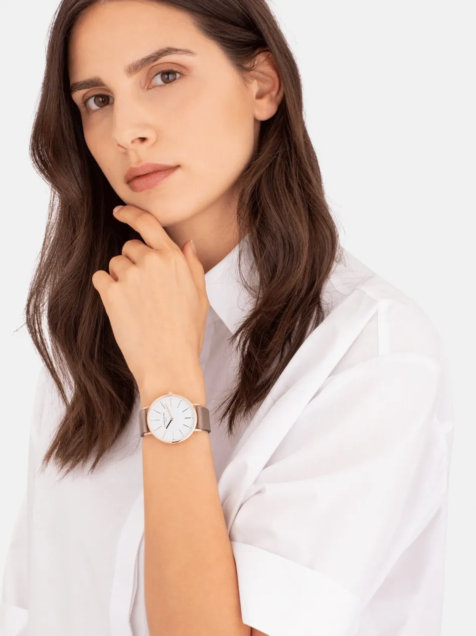 Zweizeiger Damenuhr der Marke LIEBESKIND BERLIN mit Edelstahlgehäuse und hochwertigem Lederarmband.