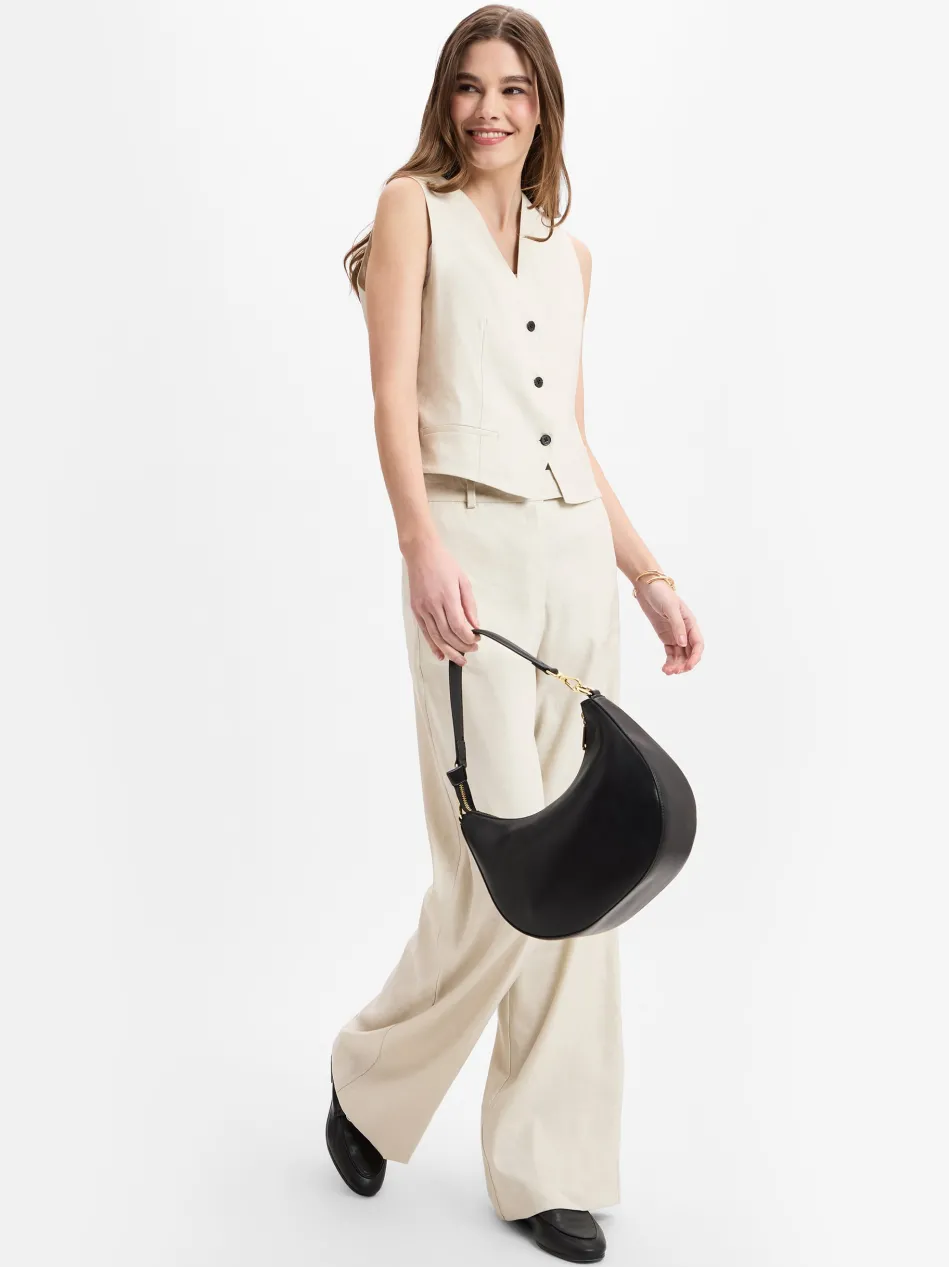 Die elegante Anzugsweste von Marc O’Polo, zusammen mit der perfekt abgestimmten Hose, bildet ein stilvolles Ensemble, das bei jeder Gelegenheit glänzt und aus einem angenehm leichten Leinen-Viskose-Mix gefertigt ist.