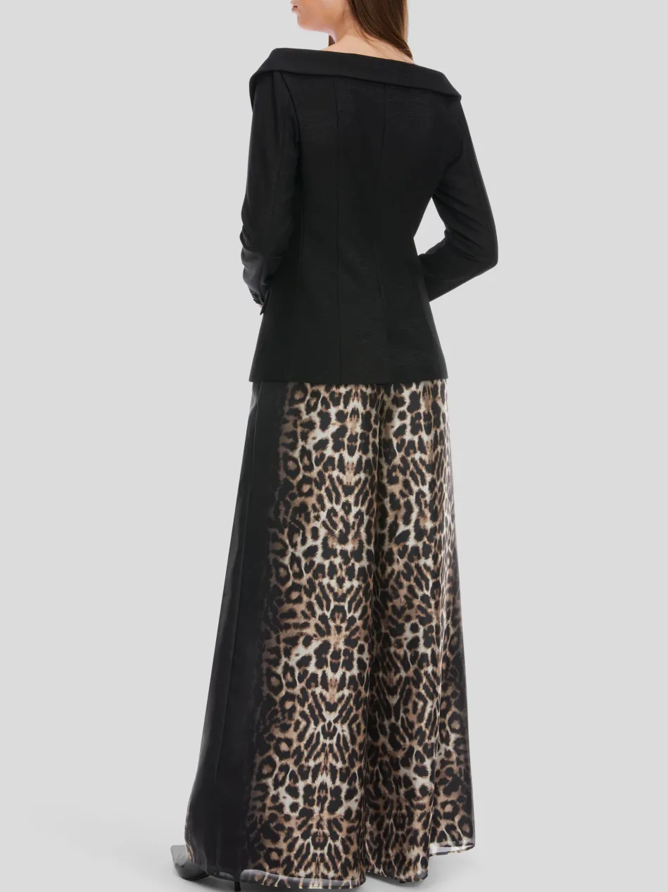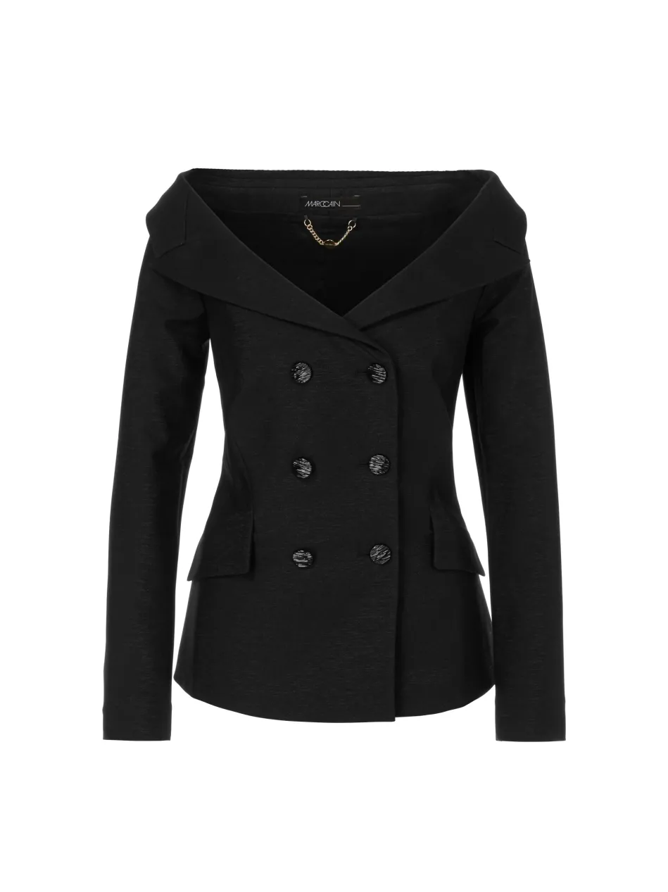 Dezent glitzernde Effekte setzen diesen Blazer in den Mittelpunkt. Auch überzeugt er mit einem extravaganten Off-Shoulder-Schnitt. Der Blazer sitzt figurnah. Dank des kleinen Stretch-Anteils trägt er sich sehr angenehm. Das zweireihige Design und das aufsteigende Revers unterstreichen das hochwertiges Flair.