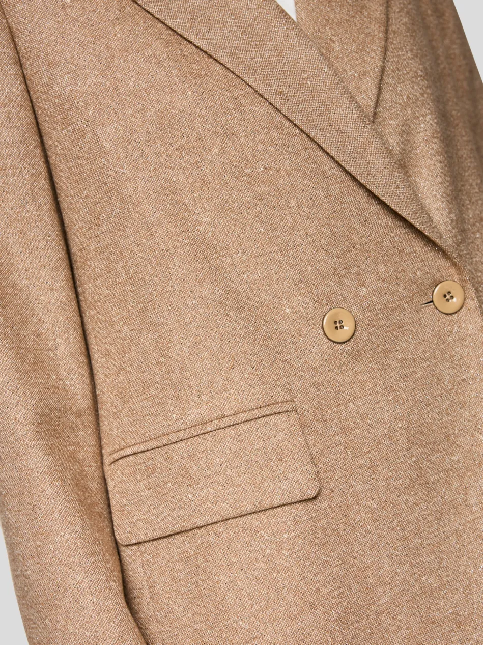Dieser zweireihige Blazer mit Revers besticht durch dezente Glitzereffekte und eine hochwertige Verarbeitung. Die Materialmischung überzeugt durch edlen Woll- und Seidenanteil, die für besonders hohen Tragekomfort und eine luxuriöse Haptik sorgen. Der weite Schnitt sorgt für eine moderne, lockere Passform und macht den Blazer zu einem vielseitigen Highlight für elegante und lässige Outfits. Ein Must-Have für stilbewusste Frauen, die zeitlose Eleganz mit einem Hauch von Glamour vereinen möchten.