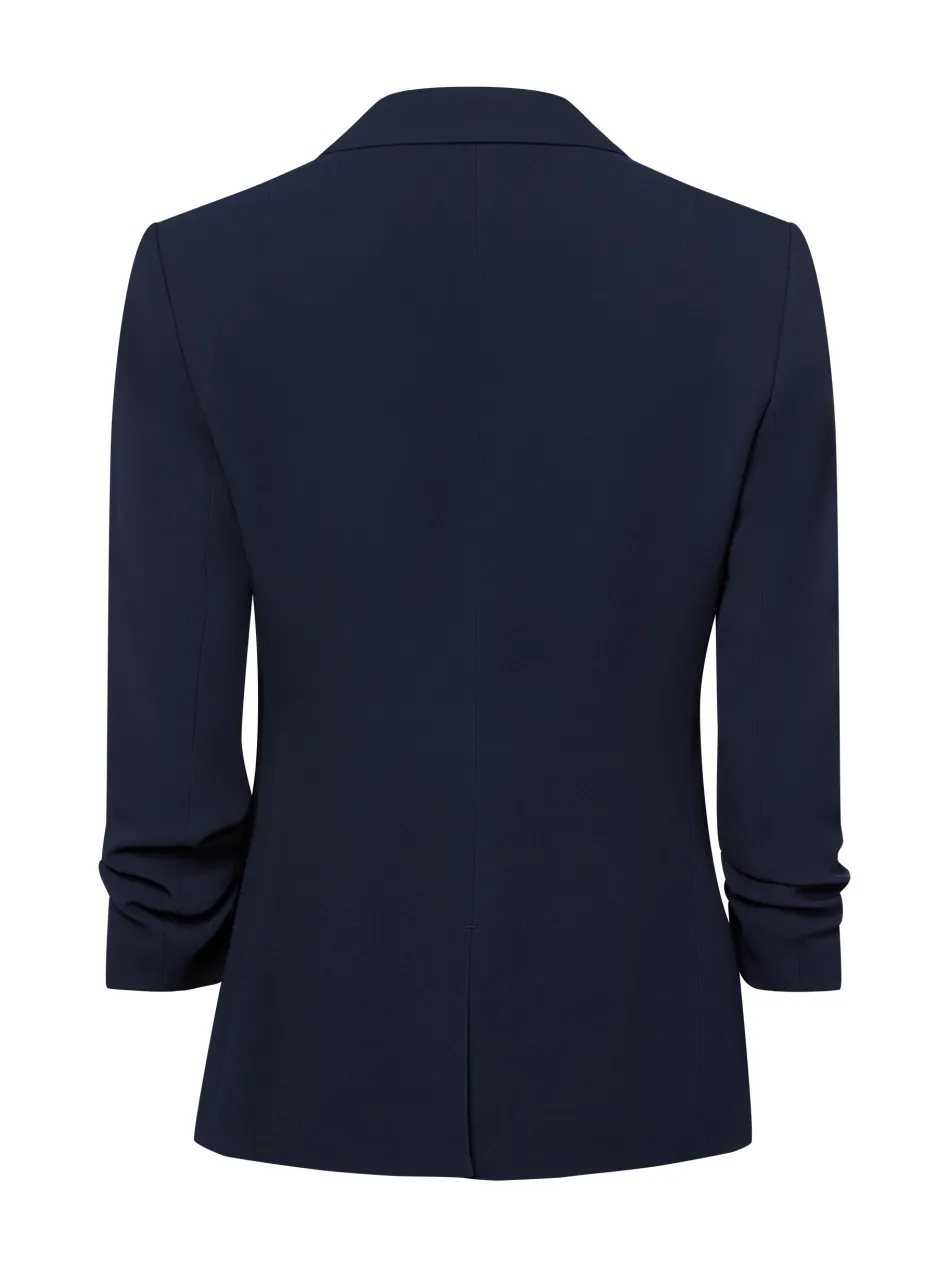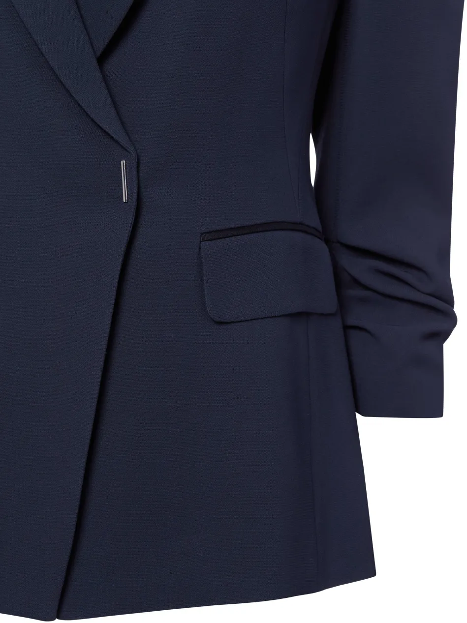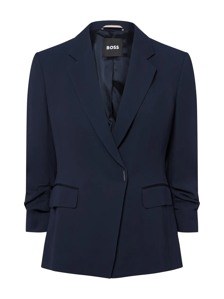 Der moderne Schnitt und die Details mit gerafften 3/4-Ärmeln, überkreuzter Vorderseite und paspelierten Pattentaschen zeichnet den BOSS Blazer Jia als Go-to-Style für das Office und Events mit smartem Dresscode aus. Der Blazer ist Teil eines Baukasten-Anzugs, kann aber auch allein getragen werden.