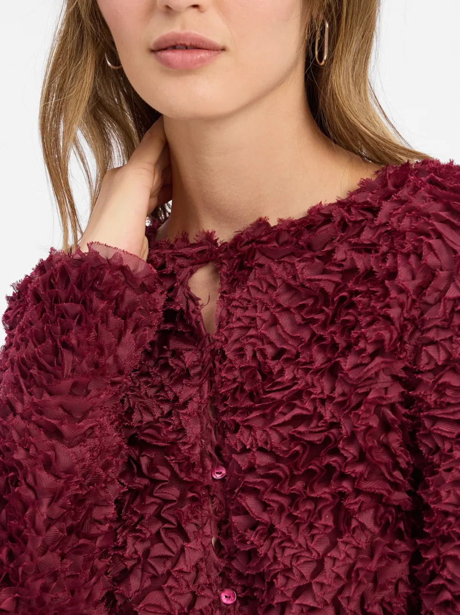 Verspieltes Style-Upgrade: Blouson von Rich & Royal überzeugt mit einem Rüschenbesatz aus Mesh, textilem Innenfutter und Knöpfen – ein modisches Highlight mit femininer Note.
