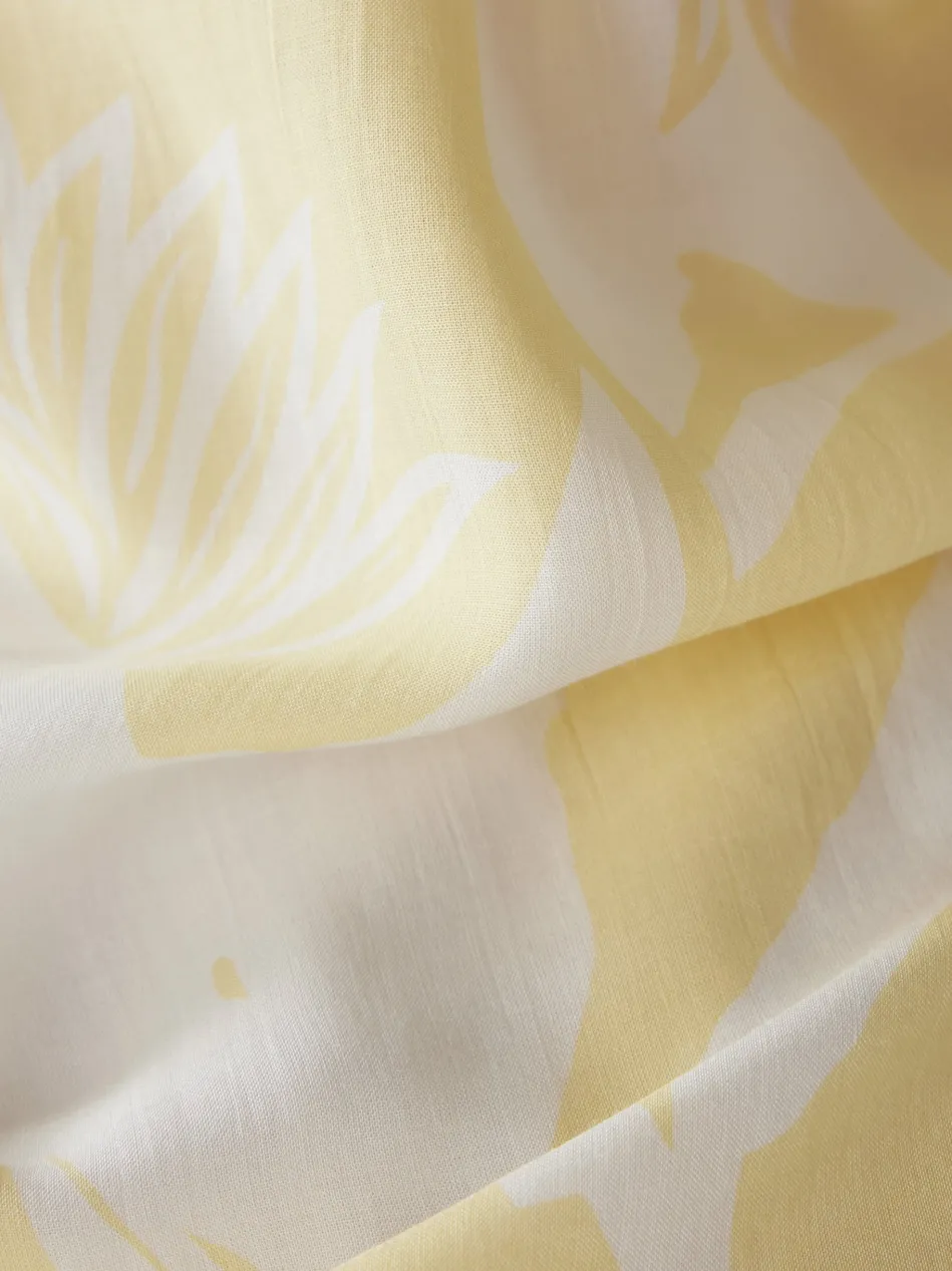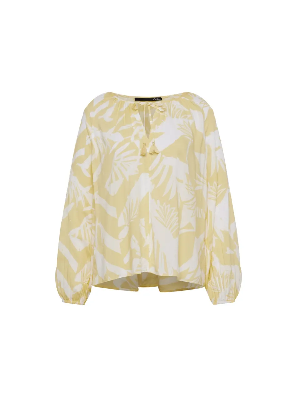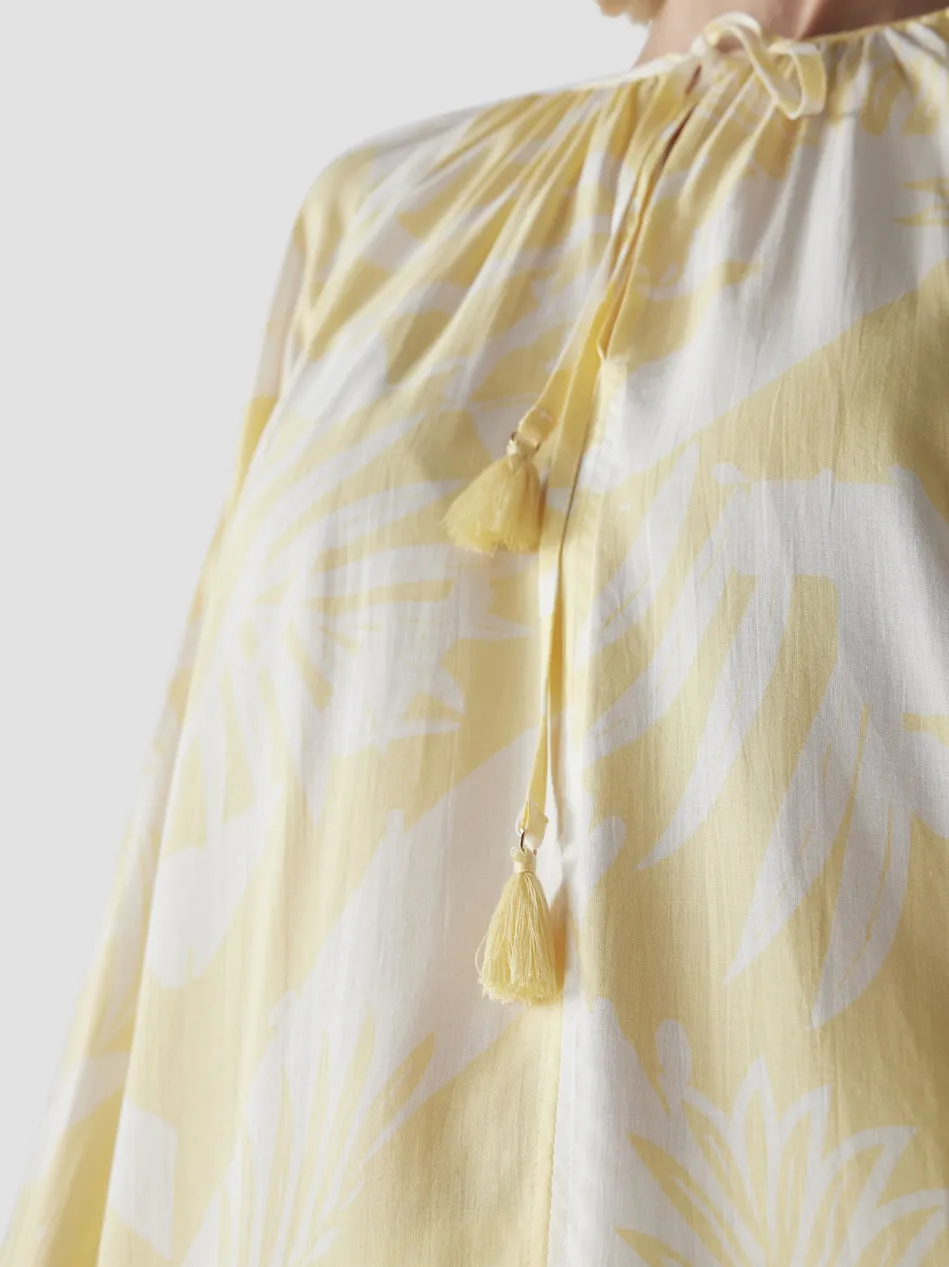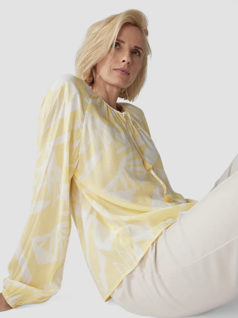 Das wunderschöne, gelb-weiße Muster erinnert an einen warmen Sommertag und sorgt für einen fröhlichen Look.Der weite Schnitt und die leichten, fließenden Materialien bieten ein angenehmes Tragegefühl.Luftiger Schnitt für maximalen Komfort.Verspieltes Muster in Gelb-Weiß.Bindeband mit Quasten als feminines Detail.Perfekt kombinierbar mit einer hellen Jeans oder einem Rock – diese Bluse ist ein echter Hingucker für stilbewusste Frauen!