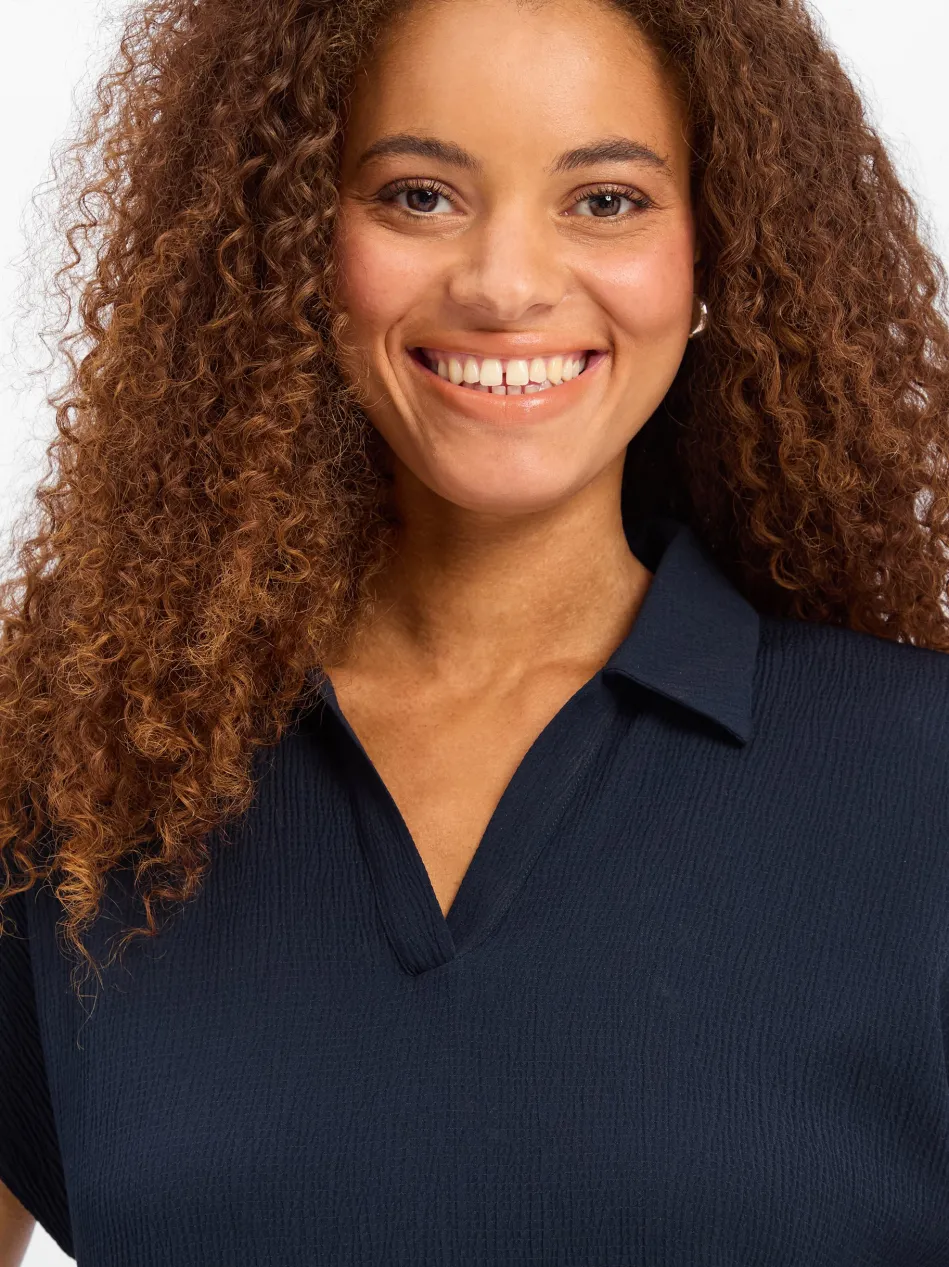 Lässiger Chic: das Kleid Wannie von Opus aus gecrinkeltem Viskose-Mix überzeugt mit Hemdblusenkragen und V-Ausschnitt, extrakurzen Ärmeln, Schulterpasse mit Quetschfalte sowie einer geraden Silhouette.