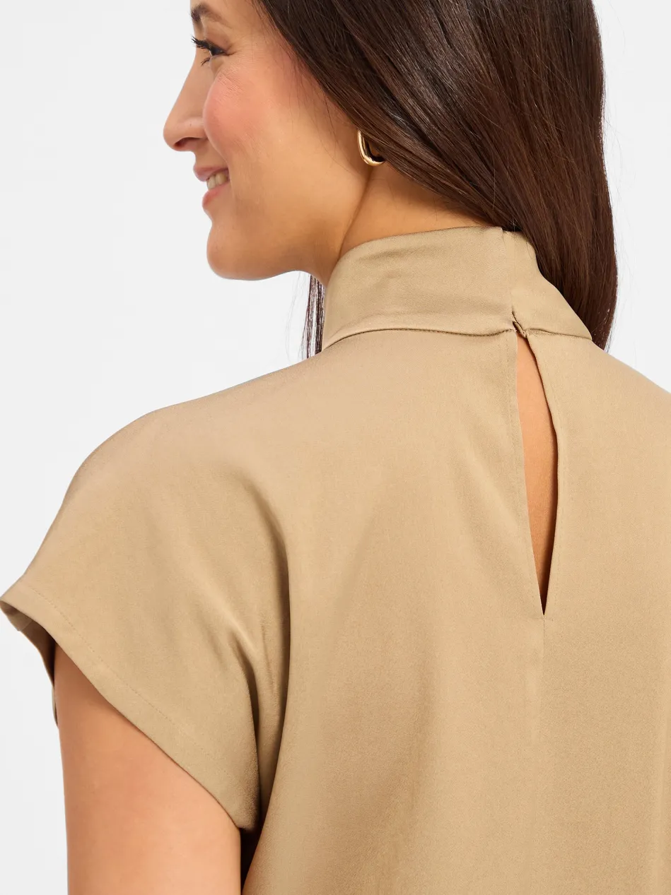Das Blusenshirt Alaria_1 von Drykorn zeichnet sich durch den seidig schimmernden Satin-Look und die edgy Silhouette mit Stehkragen aus.