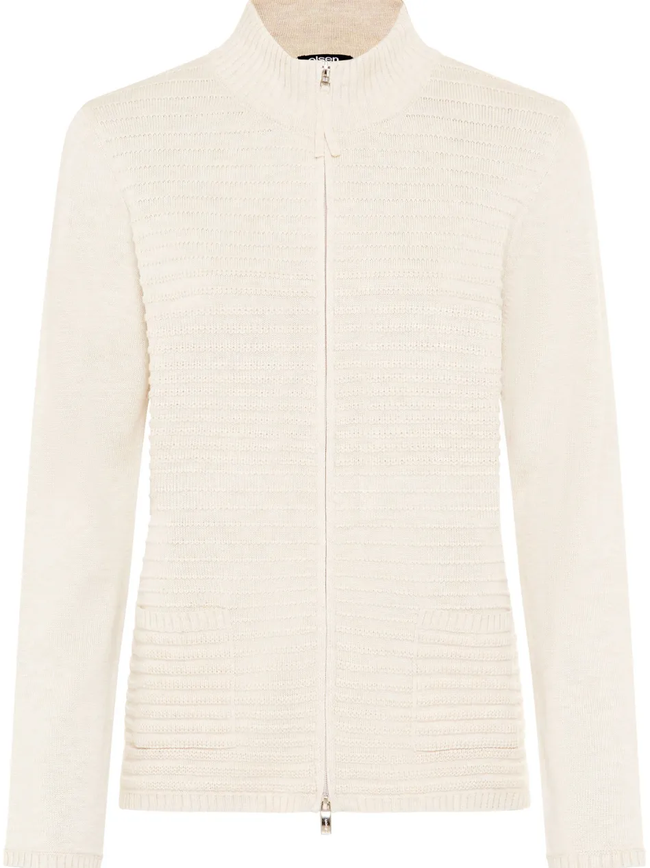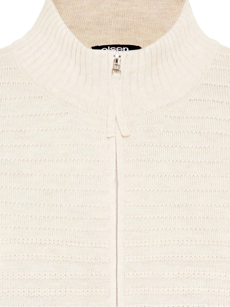Dieser stylishe Cardigan vereint modernen Stil mit höchstem Komfort. Die Vorderseite besticht durch eine elegante Streifen-Optik, während die Rückseite und die Ärmel glatt gestrickt sind, was einen schönen Kontrast ergibt. Der Stehkragen und die langen Ärmel machen ihn zu einem idealen Begleiter für kühlere Tage. Die eng anliegende, taillierte Form betont die Silhouette und sorgt für eine schmeichelhafte Passform.