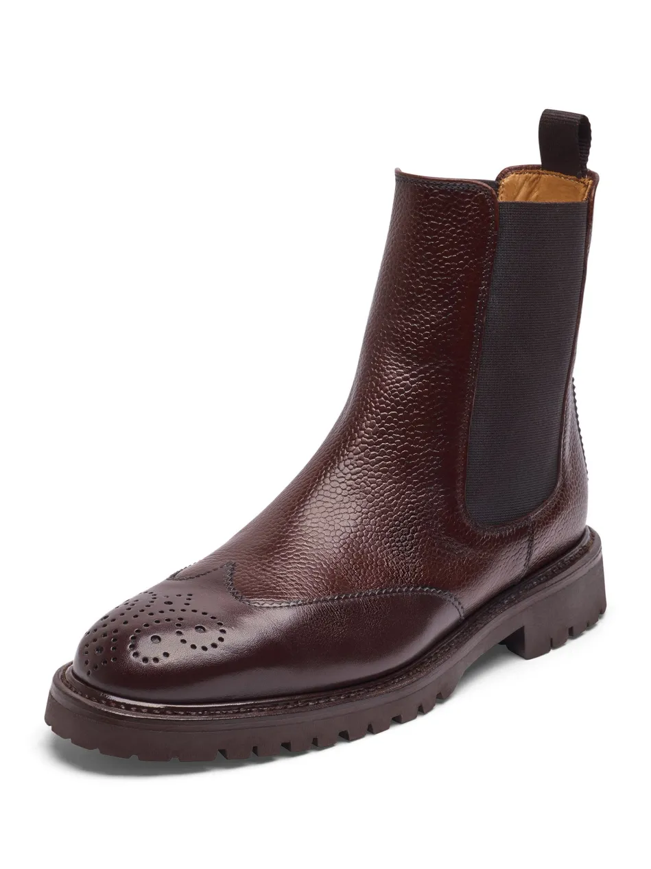 Der Bonnie Full-Brogue Chelsea Boot aus geprägtem Kalbsleder bietet ein Innenmaterial aus vegetabil gegerbtem Leder. Mit einer Gummisohle und handgefertigter, rahmengenähter Konstruktion vereint er Komfort und Stil. Hergestellt in Spanien.