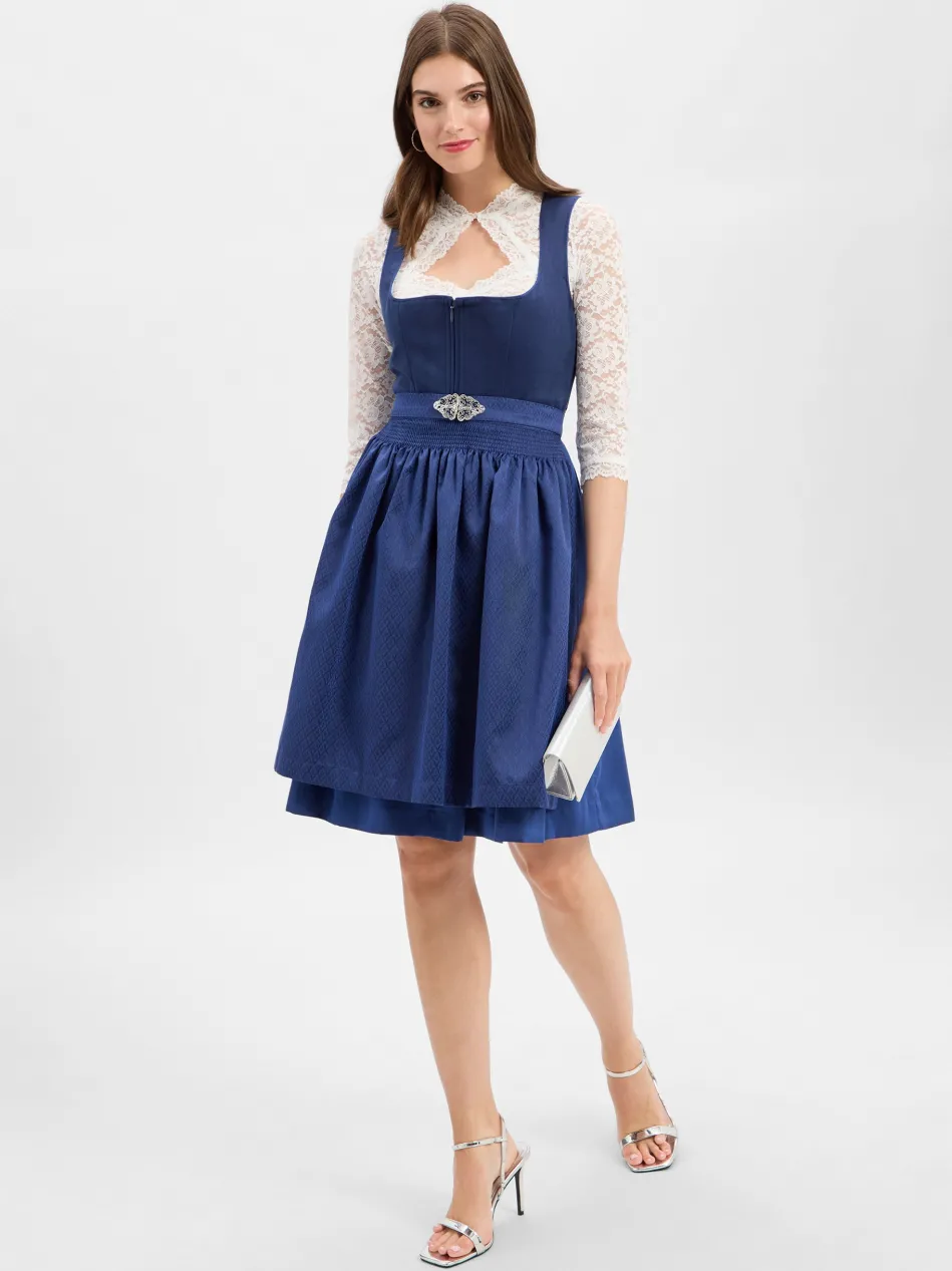 Festliches Dirndl von Krüger mit tiefem Ausschnitt, Faltenrock und Schürze mit silberner Brosche.