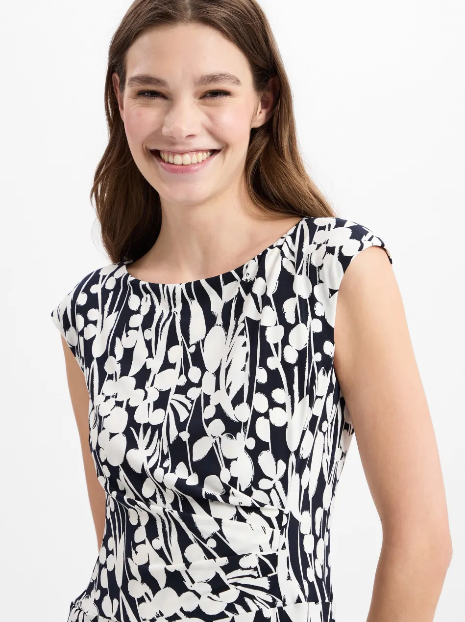 Das kurze, sommerliche Kleid von Ambiance überzeugt mit seinem maritimen Charme. In Marineblau mit weißen Punkten und einer eleganten Drapierung an der Taille schmeichelt es der Figur und sorgt für eine feminine Silhouette.