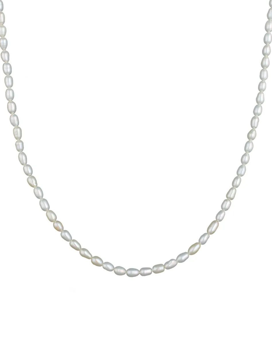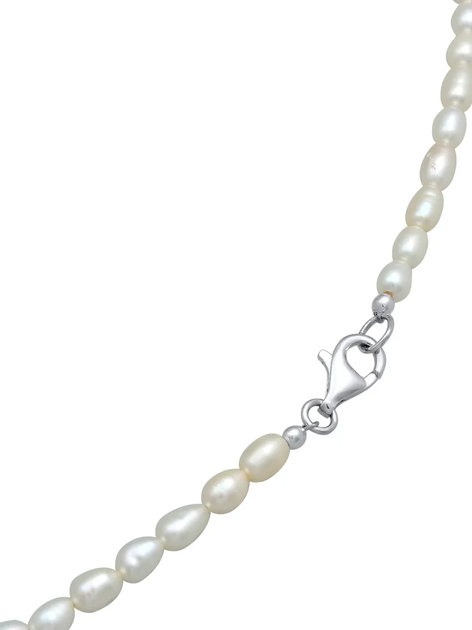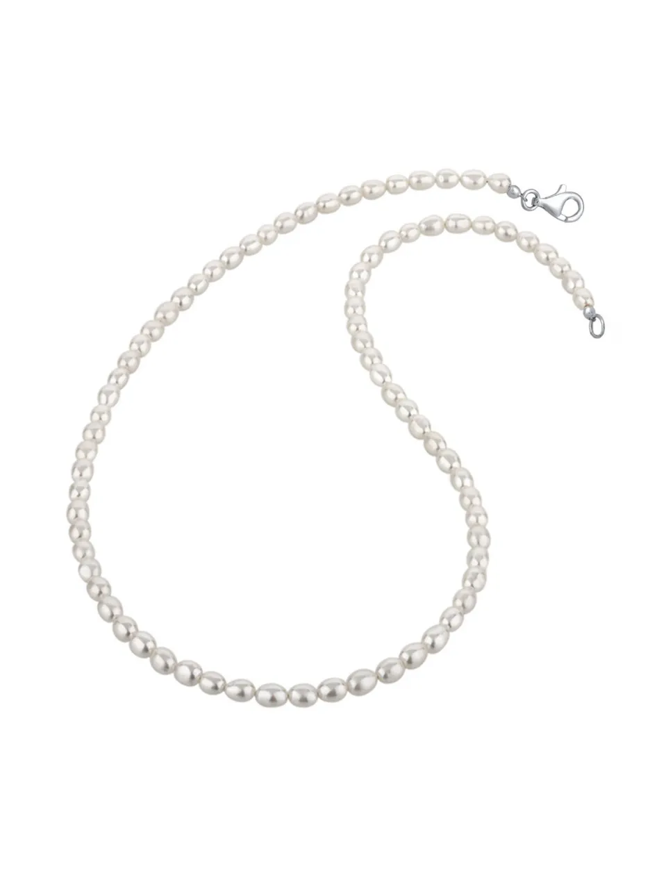 Klassisch zeitlose Perlenkette aus echten Süßwasserzuchtperlen in Weiß und einer Karabiner-Schließe aus 925 Sterling Silber. Die außergewöhnliche Süßwasser-Zuchtperlenkette in der selten ovalen Perlenform gehört zu der Grundausstattung jeder Schmuckschatulle. Eine durchgehende Perlenkette ist auch als Schmuckstück zu einem sportlichen Outfit gut geeignet.