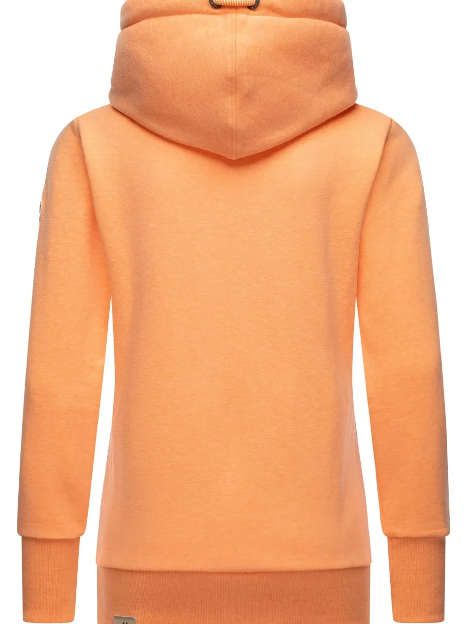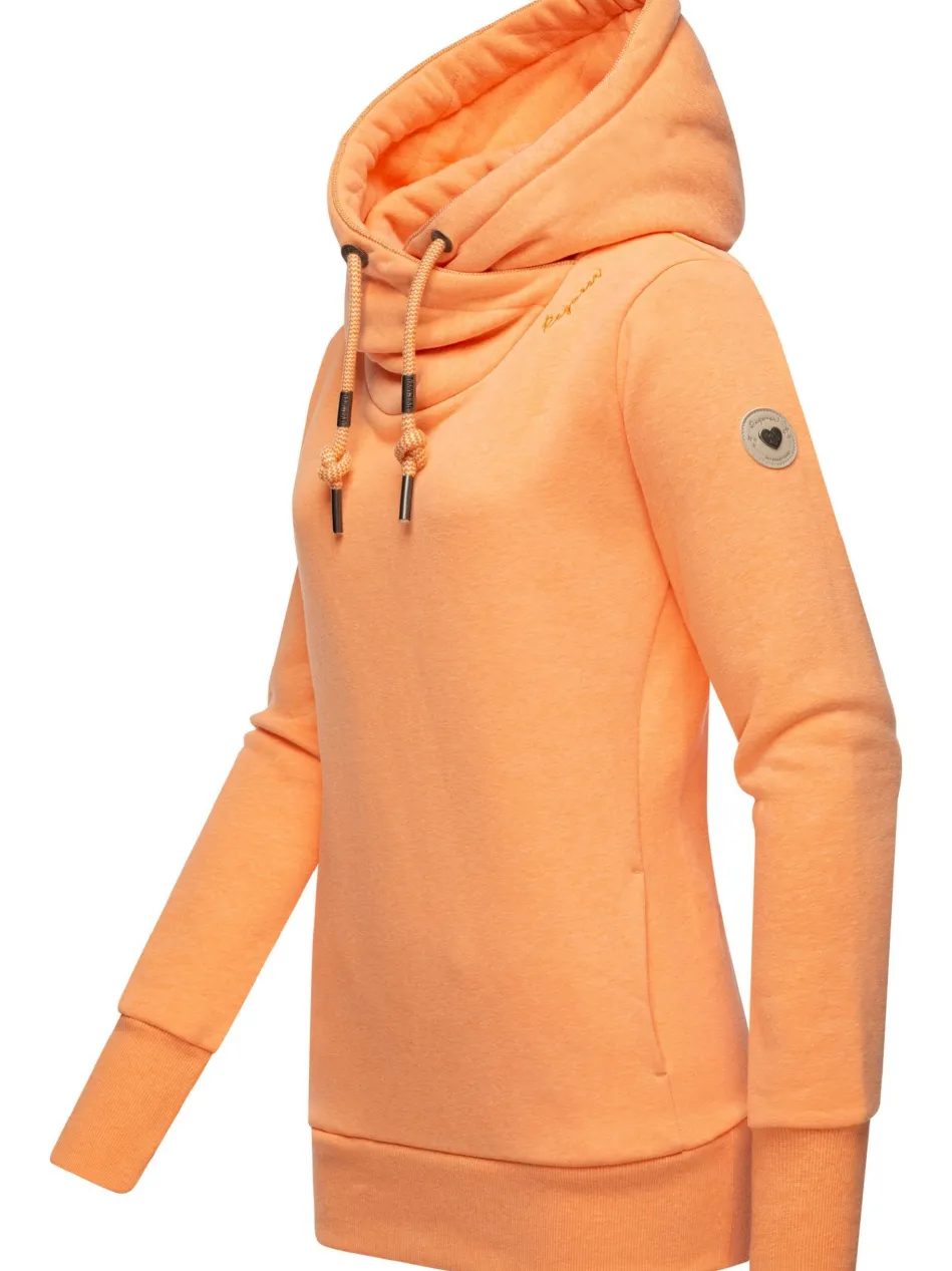 Langärmliger superweicher Sweatpullover für Damen mit großer Kapuze und seitlichem Kragen mit Tunnelzugkordeln.
