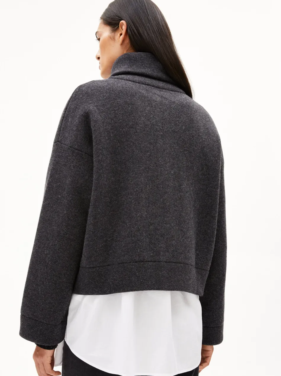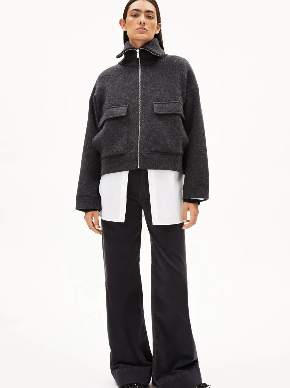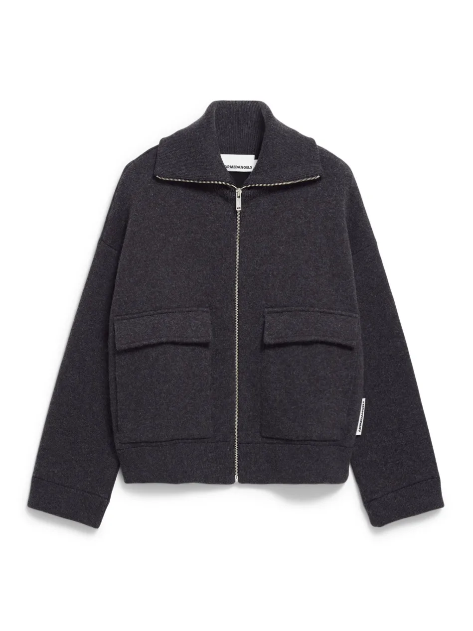 Die ARMEDANGELS Jacke Joaniaas im Blouson-Stil besticht durch ihre legere Passform und die kuschelige Schurwoll-Optik – hält stilvoll und garantiert warm.