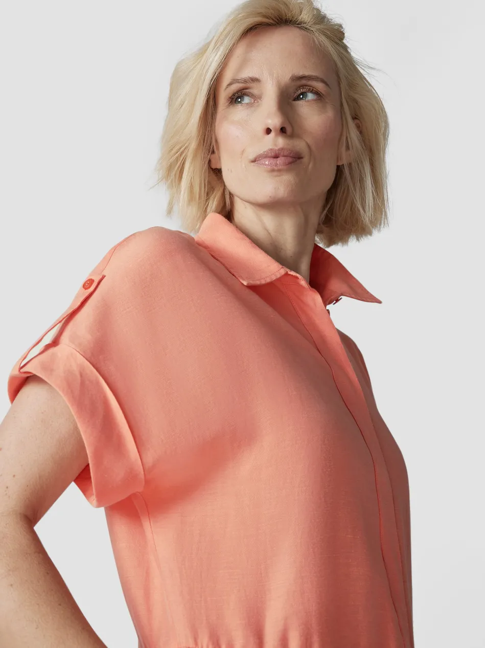 Dieses Hemdblusenkleid vereint Komfort und Stil in einem sommerlichen Design. Der klassische Kragen, die verdeckte Knopfleiste und die raffiniert geraffte Taillenpartie sorgen für eine schmeichelhafte Silhouette.Verdeckte Knopfleiste für eine cleane Optik.Leicht geraffte Taille für eine feminine Silhouette.Kurzarm mit Riegel zum Fixieren für variable Styles.Klassischer Hemdkragen als dezenter Blickfang.Luftiges Material – ideal für Frühling und Sommer.