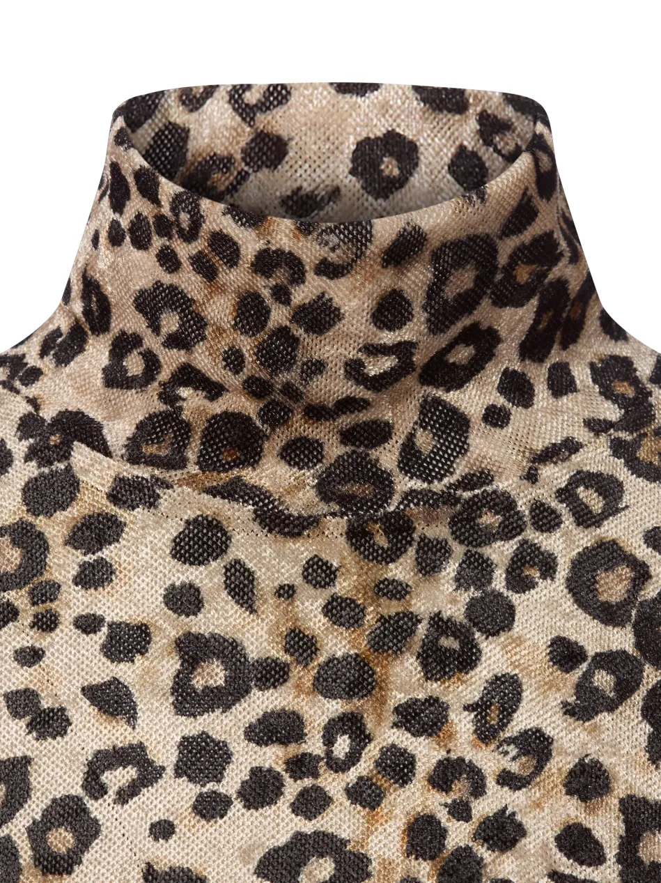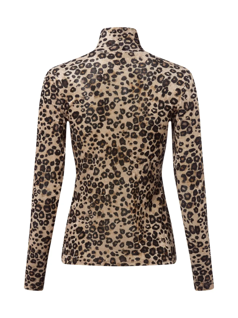 Das Langarmshirt von Marc Cain Collection aus samtigem Mesh-Material mit Leo-Design und Stehkragen vereint extravaganten Stil mit femininer Raffinesse.