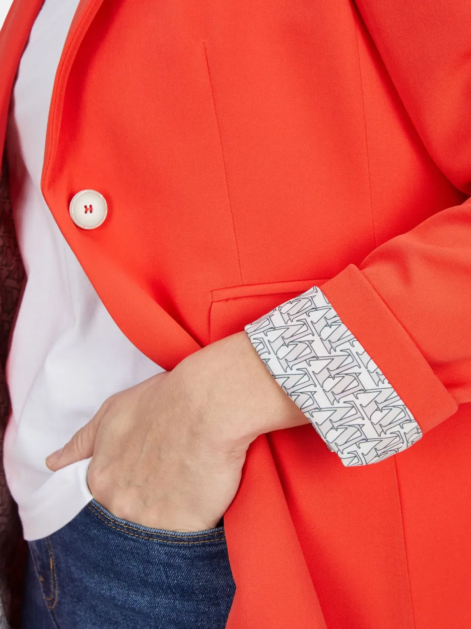 Der Girlfriend-Blazer überzeugt mit langem Revers in Spitzfacon, einem Knopf und edlen Paspeltaschen mit Patte. Der Rückenschlitz sorgt für Komfort, das hochwertige Futter mit Wording-Print und der Ärmelbeleg mit Druckfutter setzen modische Highlights. Stretchfutter in den Ärmeln bietet zusätzliche Bewegungsfreiheit. Voll gefüttert. Länge Gr. 38: 74 cm.
