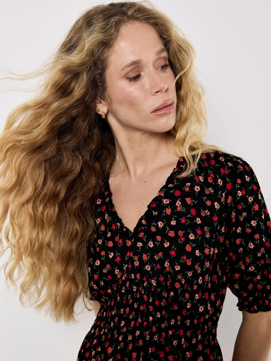 Ergänzen Sie Ihre Garderobe um feminine Blumendrucke mit diesem auffälligen Kleid. Es ist leicht und gewebt, fällt auf eine schmeichelhafte Midi-Länge und verfügt über einen gerüschten V-Ausschnitt, Puffärmel und eine gesmokte Taille für eine bequeme und dennoch definierende Passform.