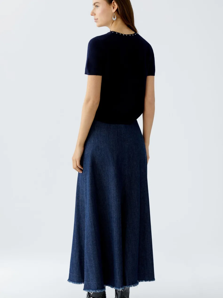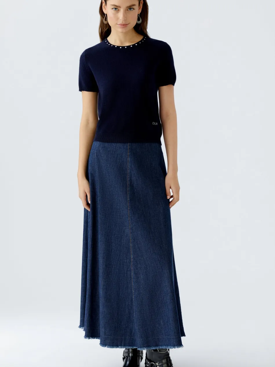Schmaler, verkürzter Feinstrickpullover mit dekorativen Ziersteinen am Rundhals