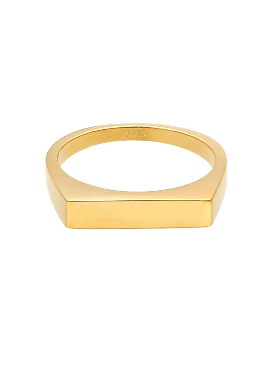 Zeitlos schlichter Siegelring für den kleinen Finger im eckigen Design. Die rechteckige Form an der Oberseite des Ringes, setzt sich kontrastreich von der hochglänzenden ästhetischen Ringschiene ab. Dieses Schmuckstück im minimalen und puristischen Look ist der absolute Eye-Catcher der Saison und ein unverzichtbares Accessoire für den Alltag.