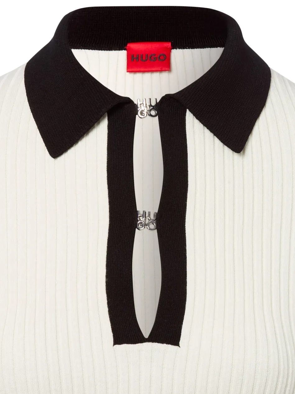 Freizeit-Style im Hybrid-Design: Der figurnahe Strickpullover Sharro von HUGO kombiniert den Look eines Longsleeves mit einem stilvoll interpretierten Polokragen mit tiefen Schlitz und Logo-Haken.
