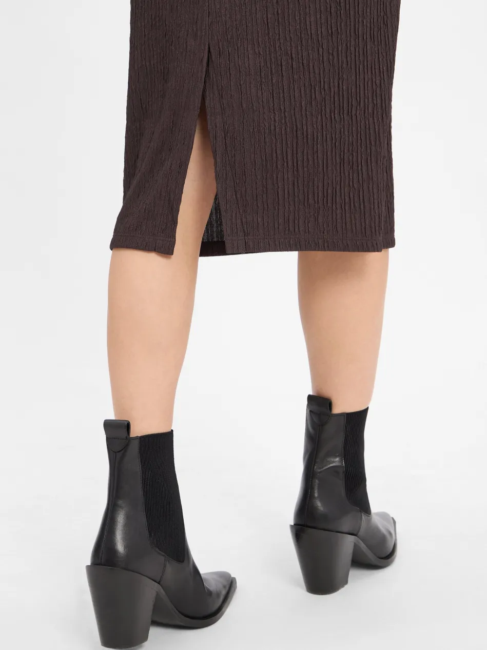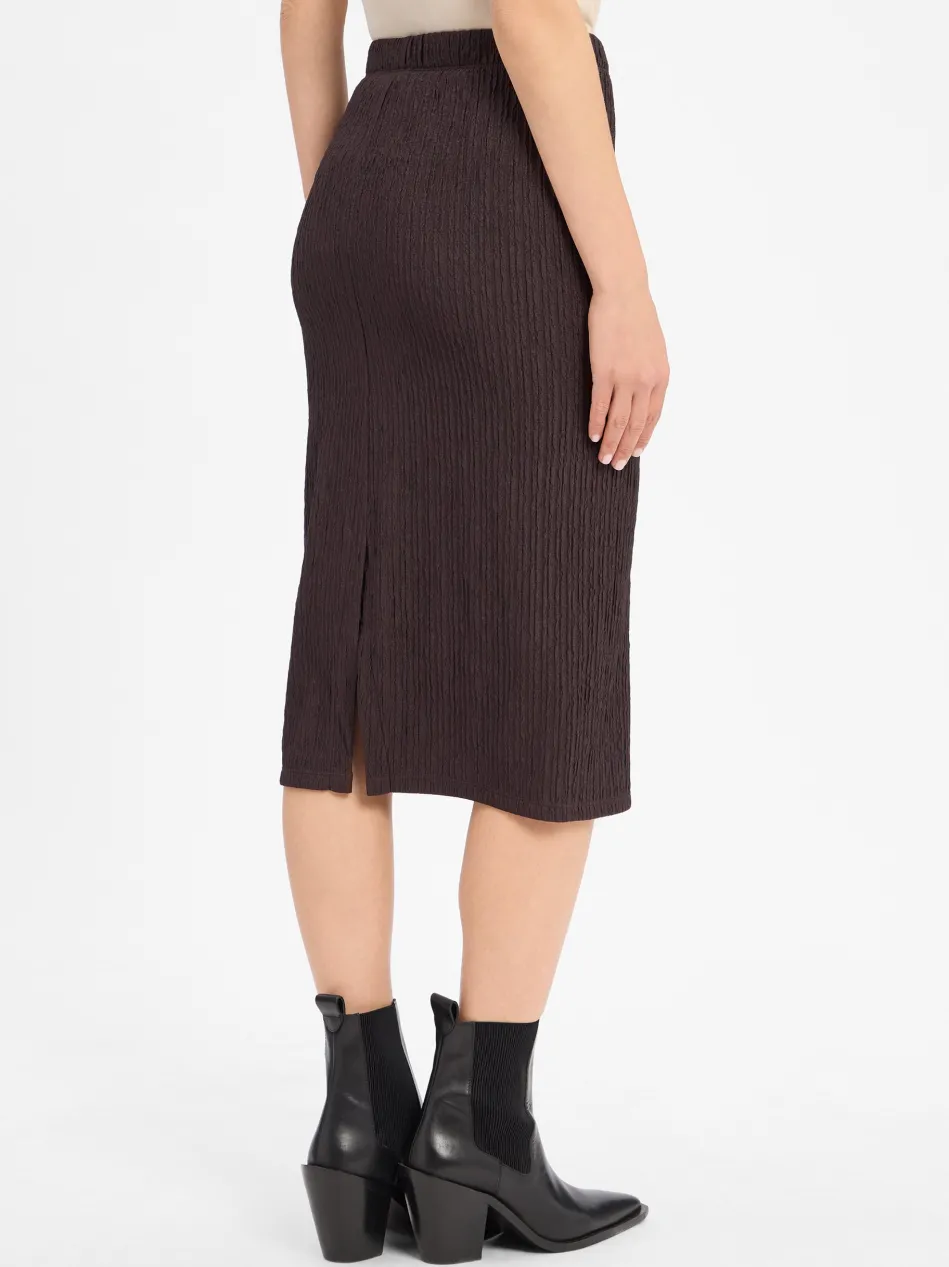 Der vielseitig kombinierbare, moderne Midi-Rock Rilasa von Opus begeistert mit elastischem Bund und rückseitigem Bewegungsschlitz in gerader Silhouette – aus gecrêpter, stretchiger Kunstfaser.