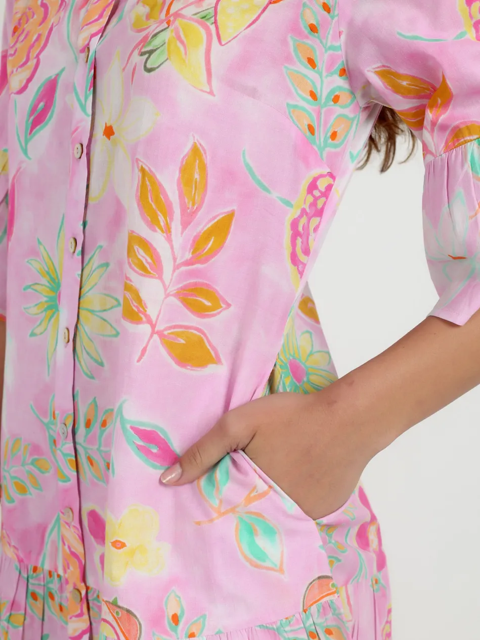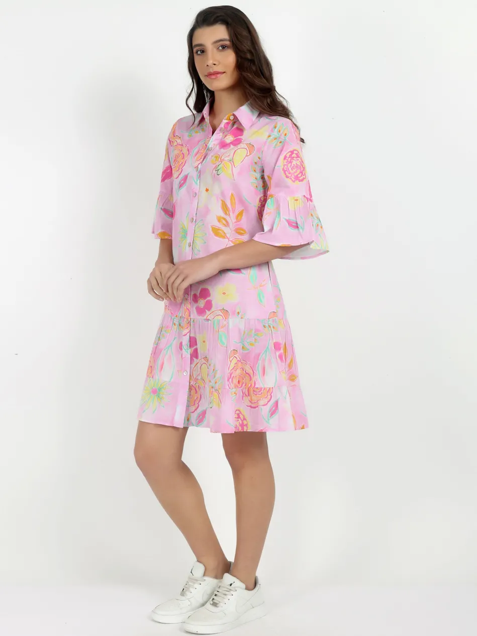 Feminines und verspieltes Baumwollkleid mit wunderschönem Druck. Der Hemdkragen verleiht dem Kleid eine elegante Note, während der ausgestellte Rockteil und die ausgestellten Ärmel den verspielten Look unterstreichen. Für einen sportlichen Freizeit-Look kombinierst du weiße Sneaker oder Loafer. Gesamtlänge: 96 cm, Brustweite: 96 cm, Taillenweite: 92 cm.