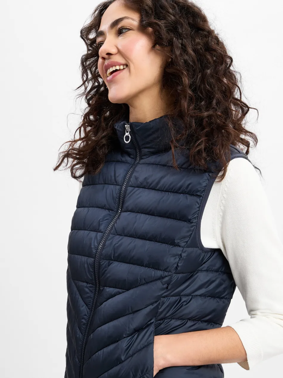 Die Steppweste von s.Oliver aus recyceltem Polyester mit Stehkragen, figurumspielender Passform und praktischem Reißverschluss kommt im sportlich-eleganten Design und wird mit einem kleinen Travelbag geliefert – der perfekte Begleiter für kühle Tage, vielseitig kombinierbar und nachhaltig zugleich!