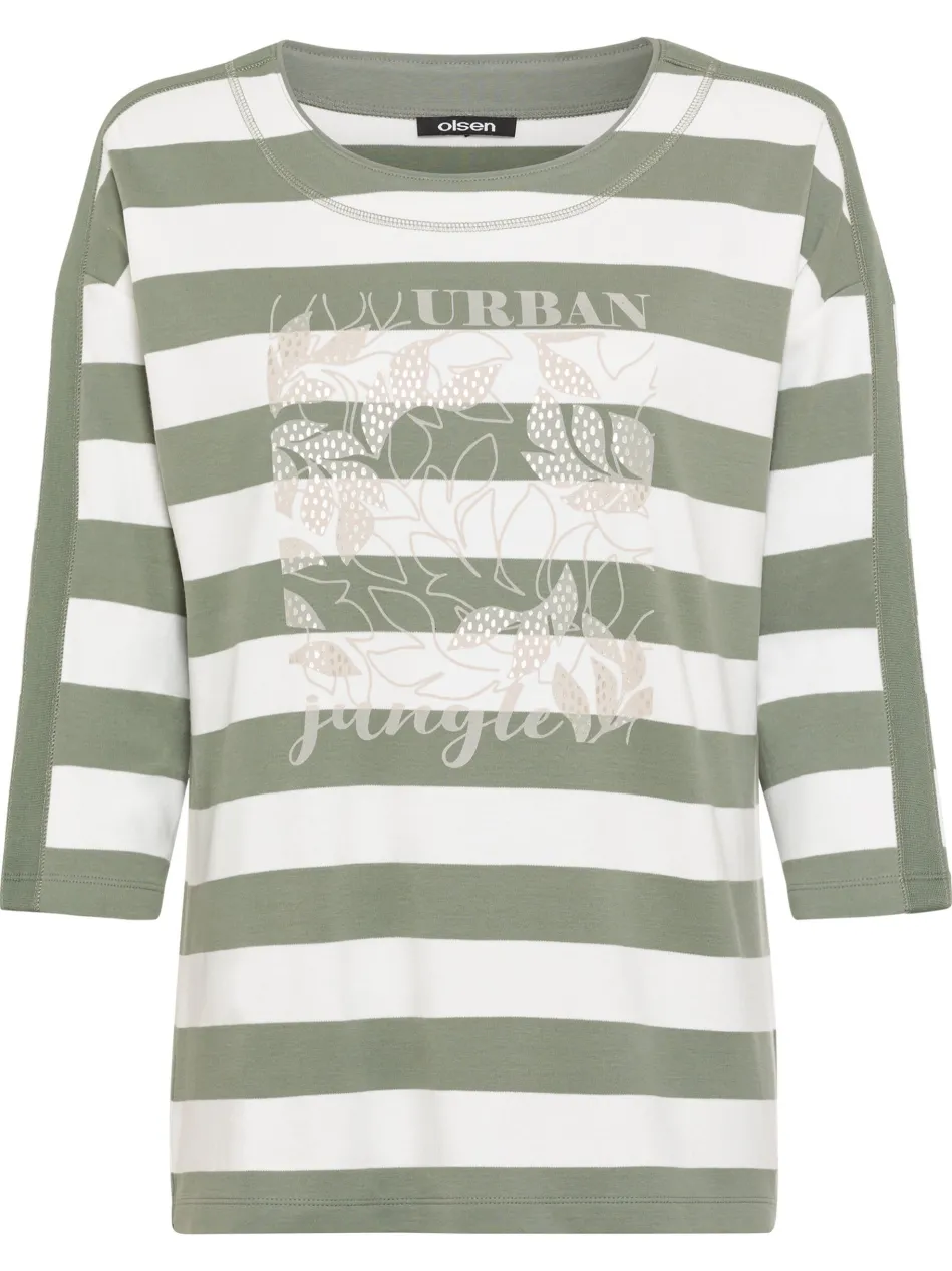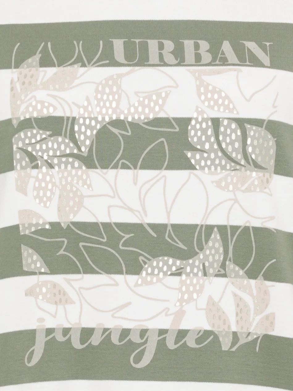 Dieses Jerseyshirt kombiniert trendige Muster mit einem lässigen Design. Der Rundhalsausschnitt und die 3/4-Ärmel verleihen ihm eine klassische Note, während der gerade Schnitt eine bequeme Passform bietet. Mit Streifen-, Blätterprint und dem Schriftzug Urban Jungle setzt das Shirt modische Akzente. Gefertigt aus reiner Baumwolle, fühlt es sich angenehm weich auf der Haut an und ist perfekt für entspannte Casual-Looks. Länge: 62 cm.