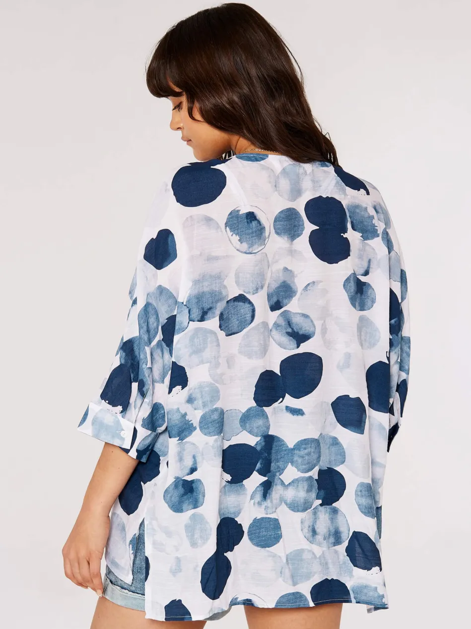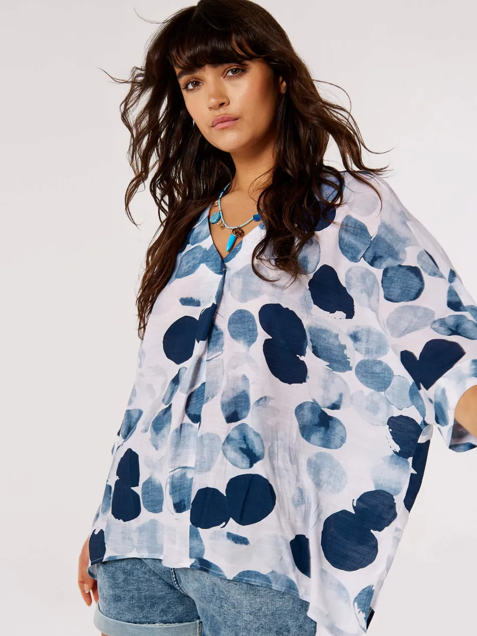 Dieses leichte, gewebte Oberteil in Oversized-Passform ist perfekt für den Boho-Sommerlook. Es wird von einem V-Ausschnitt und gekrempelten Ärmeln eingerahmt und besticht durch Falten auf der Vorderseite, dem asymmetrischen Saum und durch einen abstrakten Farbdruck.