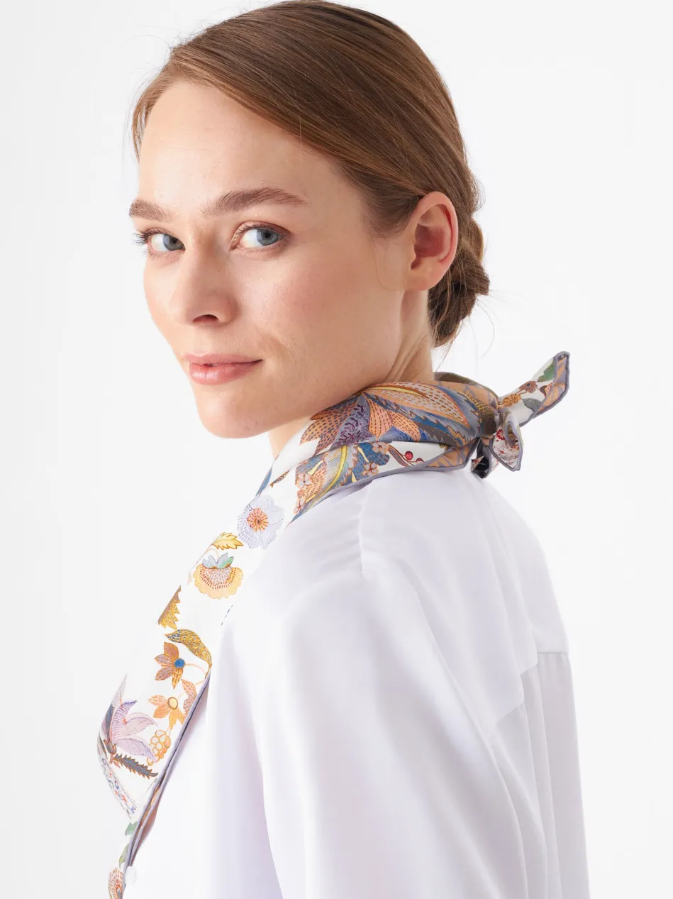 Dieses edle Mini-Carré gefällt uns mit seinem sommerlichen Blumenmuster auch ins Haar gebunden oder lässig an die Jeans geknotet sehr gut. Das edle Nickituch aus #1 Pure Silk ist im vergrößerten Trend-Format designt. Es wurde in einer ausgewählten, chinesischen Seidenmanufaktur, mit der uns eine langjährige Partnerschaft verbindet, aus wertvoller Seide gefertigt.