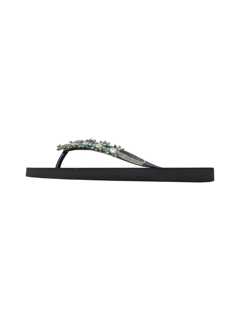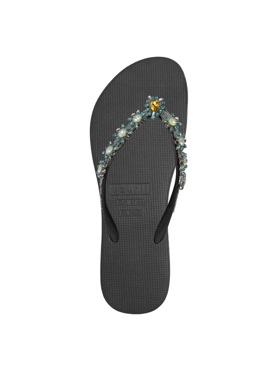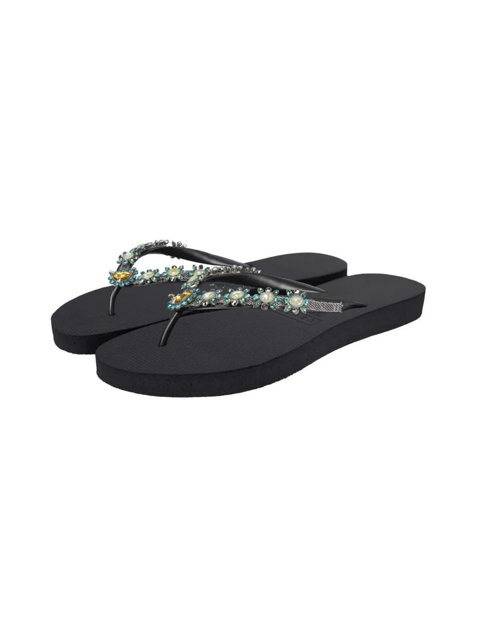 Wussten Sie, dass Dolce auf Italienisch süß und lieblich bedeutet? Der große türkisfarbene Stein in der Mitte ist umgeben von kleinen Perlen und türkisfarbenen Steinchen. Das V wird von einer silbernen Kette und einer glänzenden Vielfalt von großen und kleinen Edelsteinen bedeckt. Sie werden jedes Mal neue Details sehen, wenn Sie sich den Dolce Flip Flop ansehen, der voller kleiner Elemente ist.